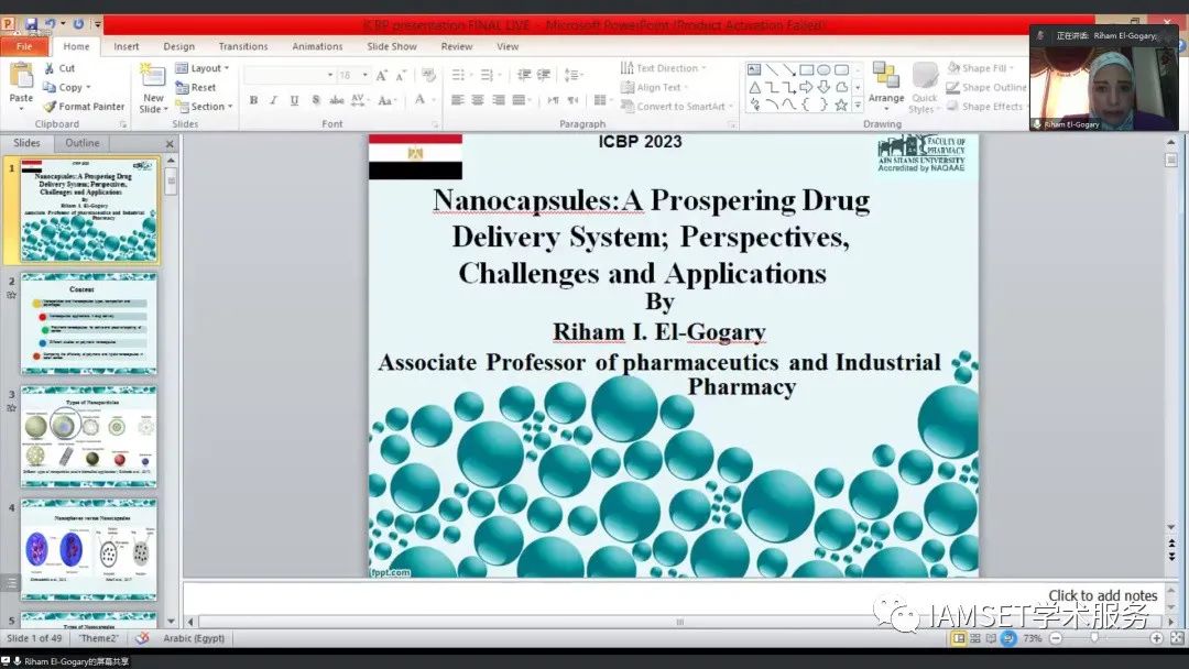 Dr. Riham El Gogary, the associate professor of Department of Pharmaceutics and Industrial Pharmacy, Faculty of Pharmacy, Ain Shams University, delivered her presentation titled “Nanocapsules: A Prospering Drug Delivery System; Perspectives, Challenges and Applications”.