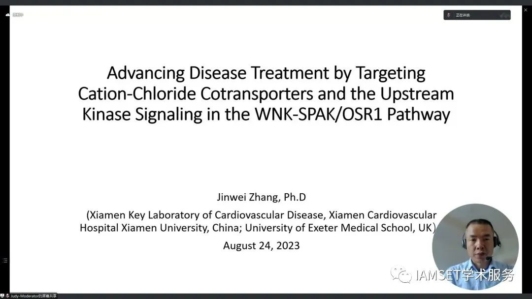 Dr. Jinwei Zhang, Principal Investigator in Medicine at the University of Exeter Medical School, Professor in Biomedical Science, Xiamen University Medical School, Editor and Associate Editor and member of the editorial boards, gave his speech titled “Advancing Disease Treatment by Targeting Cation-Chloride Cotransporters and the Upstream Kinase Signaling in the WNK-SPAK/OSR1 Pathway”.